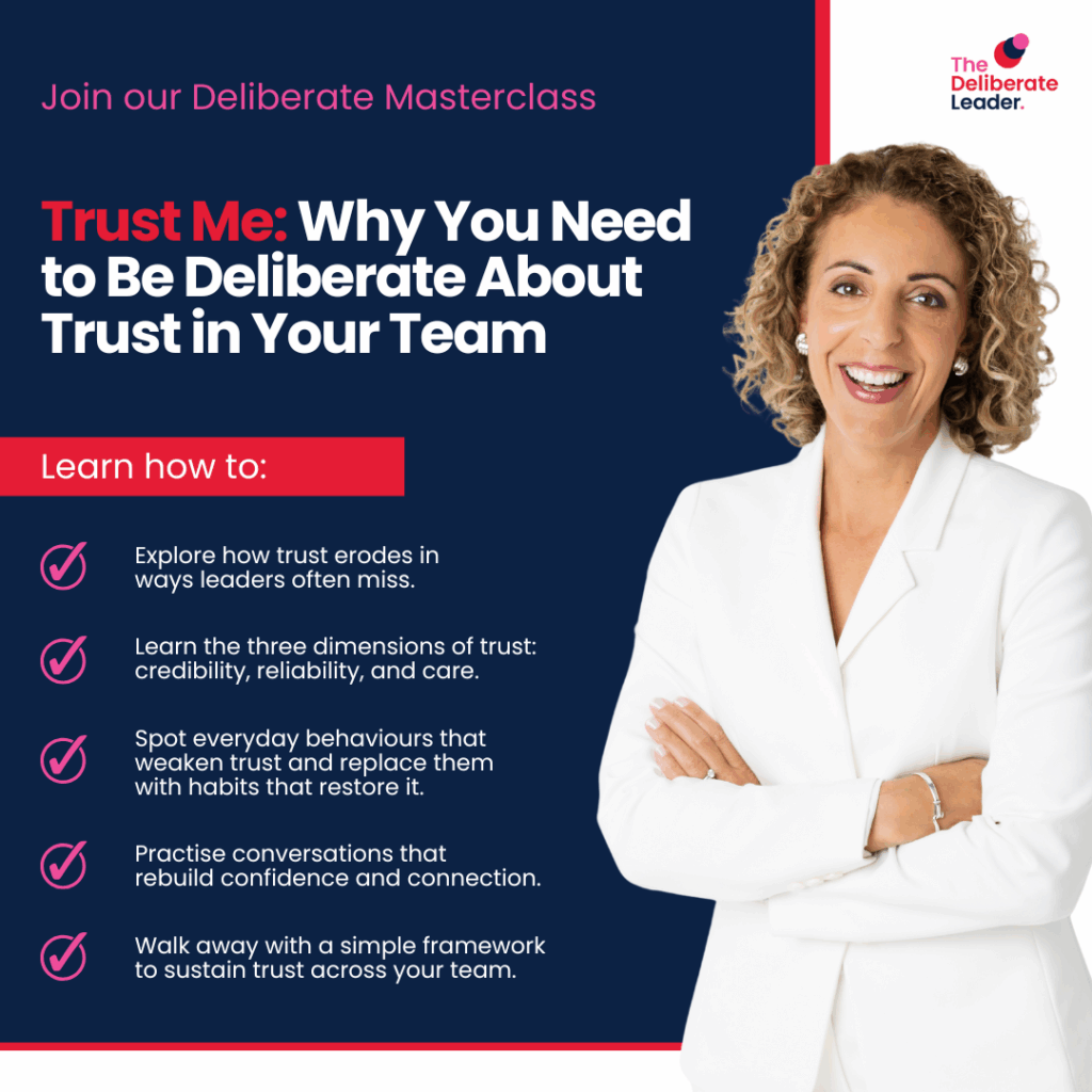 Join our FREE Deliberate Leader Masterclass: “Trust Me – Why You Need to Be Deliberate About Trust in Your Team.”